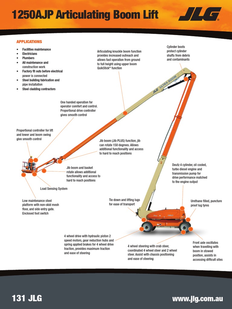 Xe nâng người JLG 1250 AJP ( động cơ diesel) 38M-40M- Được sản xuất từ hãng xe nâng người danh tiếng và uy tín số 01 thế giới. Hãng xe nâng người JLG- Mỹ (USA). Đáp ứng những tiêu chí khắt khe nhất mà mọi công trình trên thế giới yêu cầu phải có:
